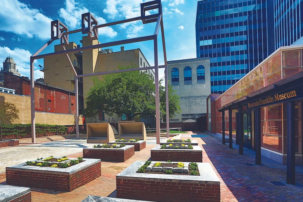 Poet and Haverford College professor Thomas Devaney, whose 2020 film Bicentennial City captures the fraught complexity of Philadelphia’s role in the celebrations of 1976, remembers an enchantingly weird element of the celebratory landscape from that year: “One of my most beloved installations [was the one that] Venturi Scott Brown did at the Franklin House,” he says. “You went down this ramp and there were neon and mirrors, and it was kind of like a disco entrance. There was a phone bank with about thirty phones, and you could call one of the founders in the middle of a sunken set piece of the Framers at Independence Hall that lit up when someone spoke.”