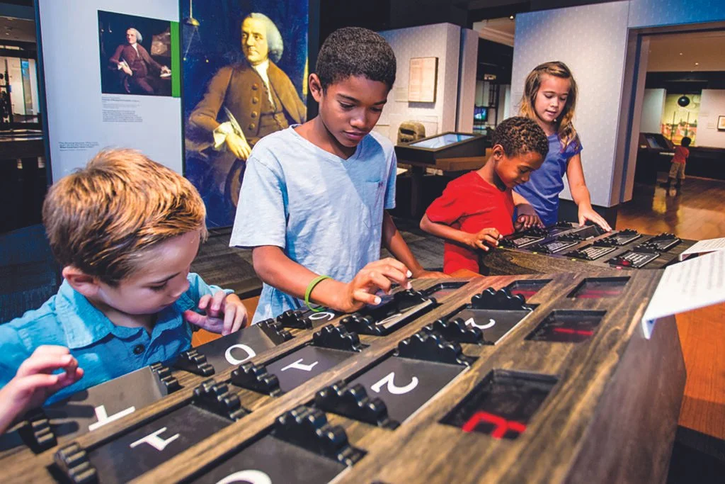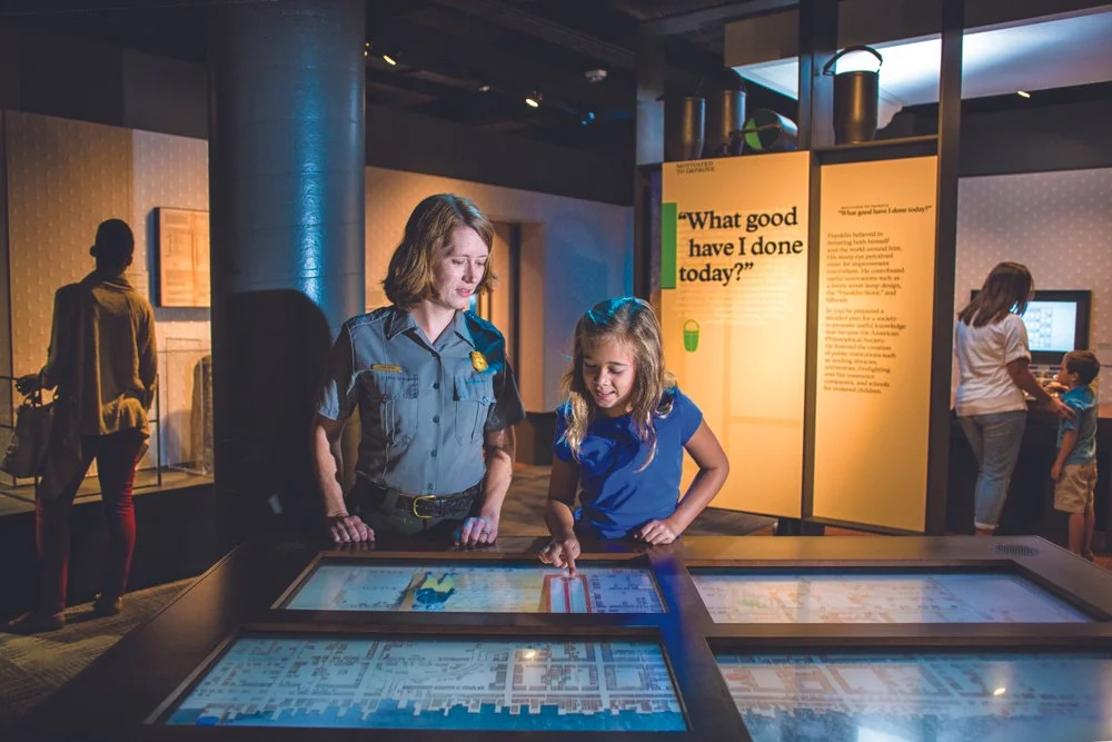 Visitors exploring exhibits at the Benjamin Franklin Museum in Philadelphia, in photographs taken by Kennedy for GPTMC, 2013. National Park Service photographs.