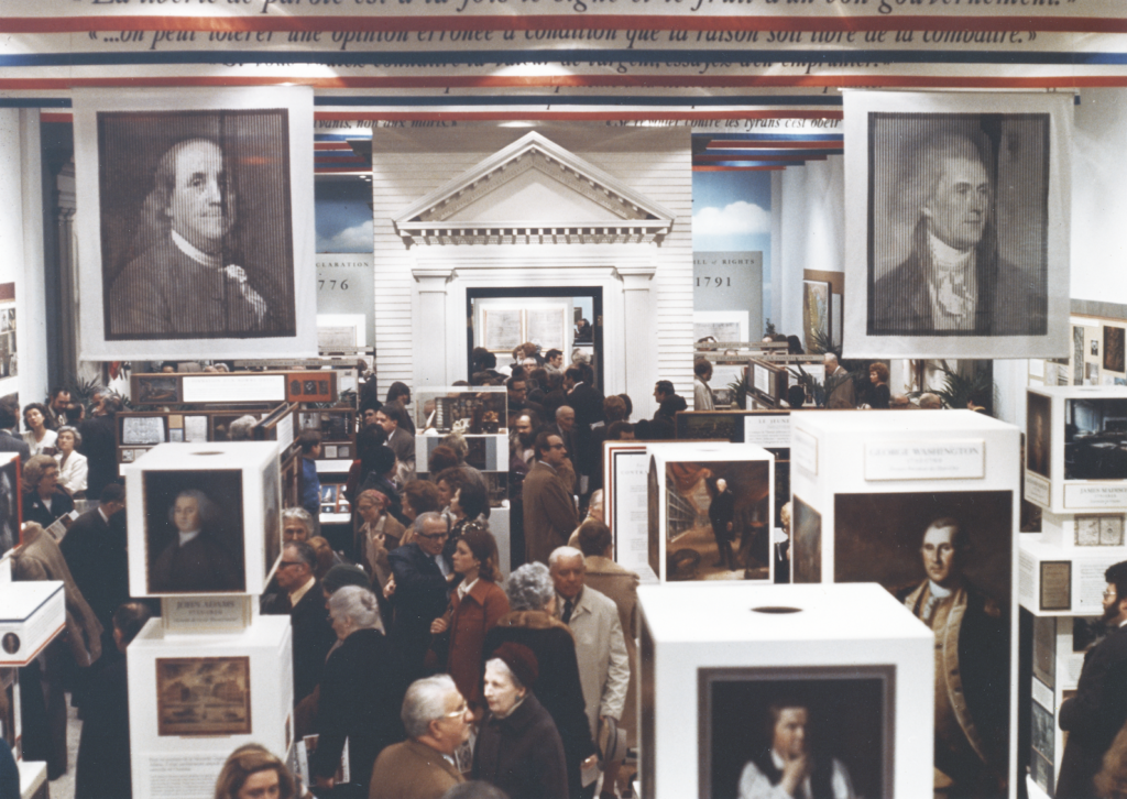 Visitors loved it—critics, not so much. London-based features reporter Hugh Hebert described the exhibition in the pages of The Guardian as “7,500 feet of brilliantly devised, grossly packaged confusion.” Hilton Kramer was less effusive in the New York Times of March 5, 1976, suggesting in his review that it needed only “a brass band and a couple of hot‐dog stands to make the atmosphere of a Fourth of July celebration complete.” But putting aside the celebratory aesthetic of the show, which even he conceded was bound to make the exhibition a hit, Kramer zeroed in on the fact that The World of Franklin & Jefferson was more like an informational display than an art exhibition. “It is not the spirit of Benjamin Franklin and Thomas Jefferson that we see in this slick display, but the spirit of modern advertising,” he wrote, “which is obliged to reduce every experience and every value to an easily identifiable sign and an easily digestible slogan.”