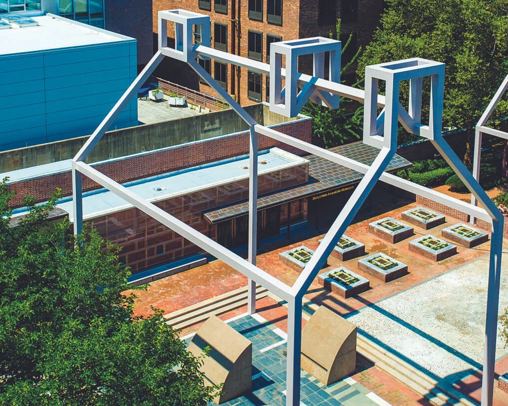 Strangely, the Eameses were not the only legends of mid-century American design to attempt a link between 1776 and 1976, nor the only ones who did so using the latest audio and visual technology. Venturi, Scott Brown, and Associates, with their deep ties to Philadelphia, were selected to design Franklin Court, a memorial to Benjamin Franklin in the heart of the city, just in time for the Bicentennial celebrations. Some of their interventions, like the austerely elegant “Ghost Houses,” remain: white frames delineating the former dimensions of five eighteenth-century dwellings near Independence Hall.