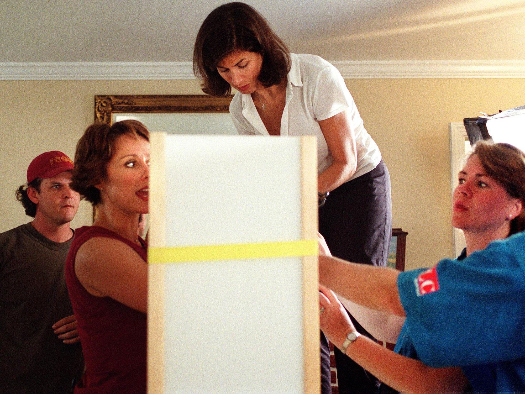Left to right: Production assistant Bruce Streukens, host Paige Davis, and designer Hildi Santo-Tomas of “Trading Spaces,” help Elaine Perkins, right, and her husband Sean. // Photo by The Washington Times/ZUMAPRESS.com