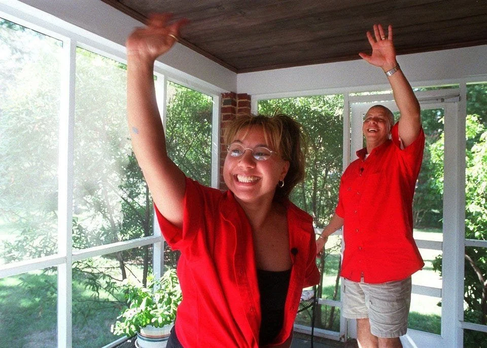 Cheryll Hairstone, left, and her husband Torrey, right, sneak a wave to their friends during the filming of the home renovation show “Trading Spaces” in 2002. // Photo by The Washington Times/ZUMAPRESS.com/Alamy